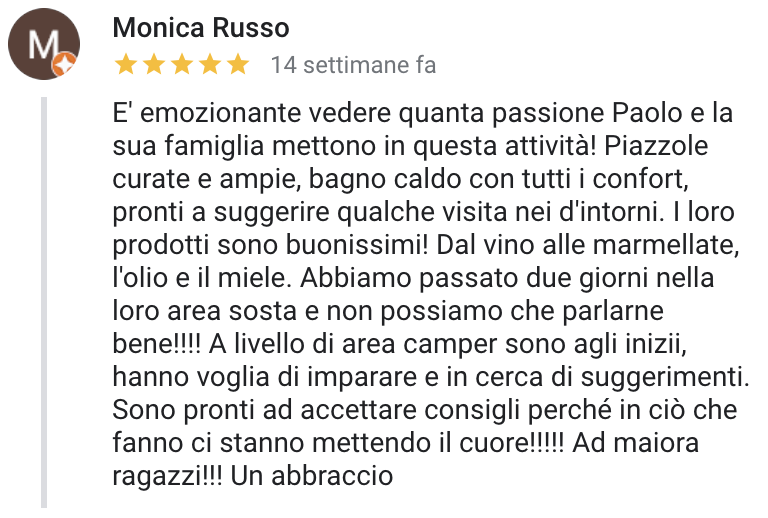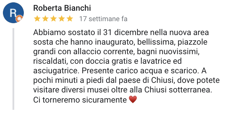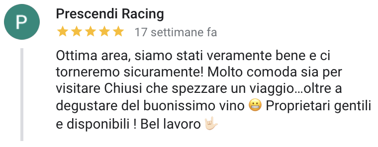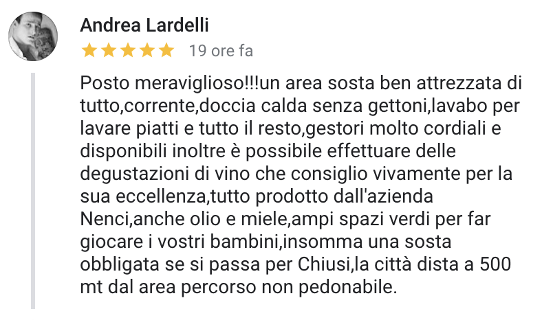 Posto meraviglioso!!!un area sosta ben attrezzata di tutto,corrente,doccia calda senza gettoni,lavabo per lavare piatti e tutto il resto,gestori molto cordiali e disponibili inoltre è possibile effettuare delle degustazioni di vino che consiglio vivamente per la sua eccellenza,tutto prodotto dall'azienda Nenci,anche olio e miele,ampi spazi verdi per far giocare i vostri bambini,insomma una sosta obbligata se si passa per Chiusi,la città dista a 500 mt dal area percorso non pedonabile.