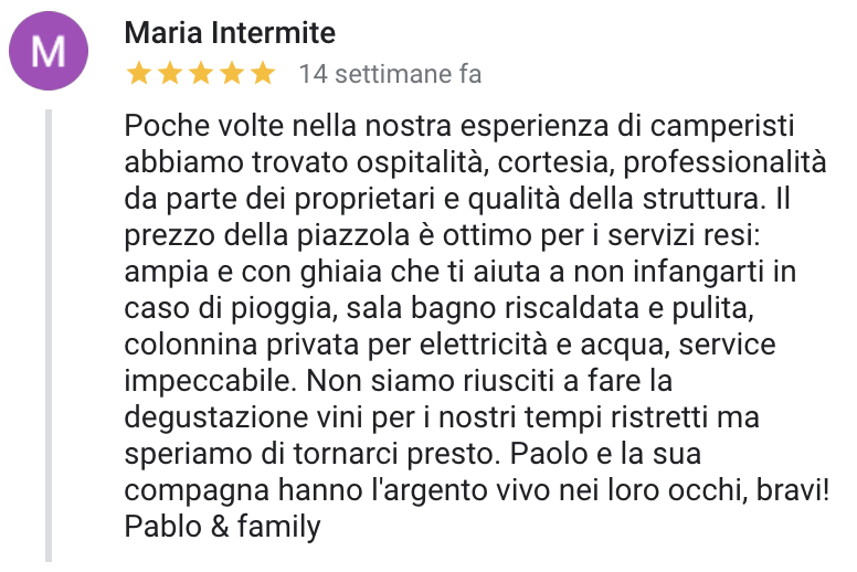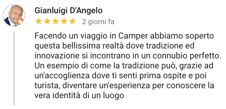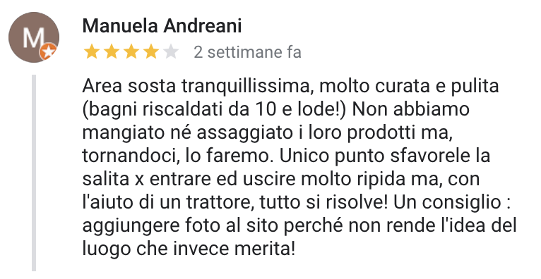 – 24 ore di sosta nella nostra area camper; – Energia elettrica; – Stanza riscaldata con: docce, bagni, lavatrice, asciugatrice, lavandino per stoviglie, tutto incluso nel prezzo; – Scarico e carico delle acque; – Area giochi per bambini; – Possibilità di fare degustazioni di prodotti tipici locali (su prenotazione).