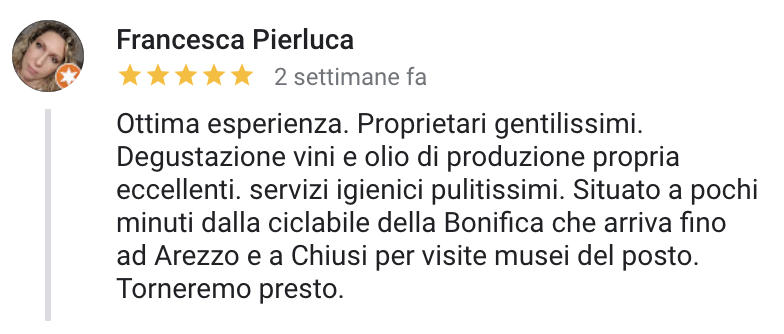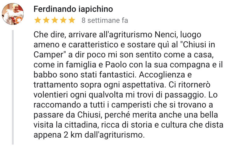 Angolo di paradiso alle porte di Chiusi, che si raggiunge a piedi con una piccola camminata di 10 min. Agricamp gestito da Paolo, dal suo papà e da tutta la famiglia. Attenzione a tutti i particolari e massima gentilezza fanno stare bene e sentire a casa. Abbiamo aperto e chiuso lì le nostre vacanze di Pasqua. Una scoperta inaspettata. Ci torneremo di certo. Le degustazioni poi...strepitose! Grazie, famiglia Nenci.