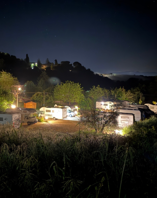 Tariffa unica: 30€ a notte tutto incluso, nessuna caparra. Piazzole ampie, docce calde gratuite, lavatrice inclusa, Wi-Fi, accoglienza familiare.